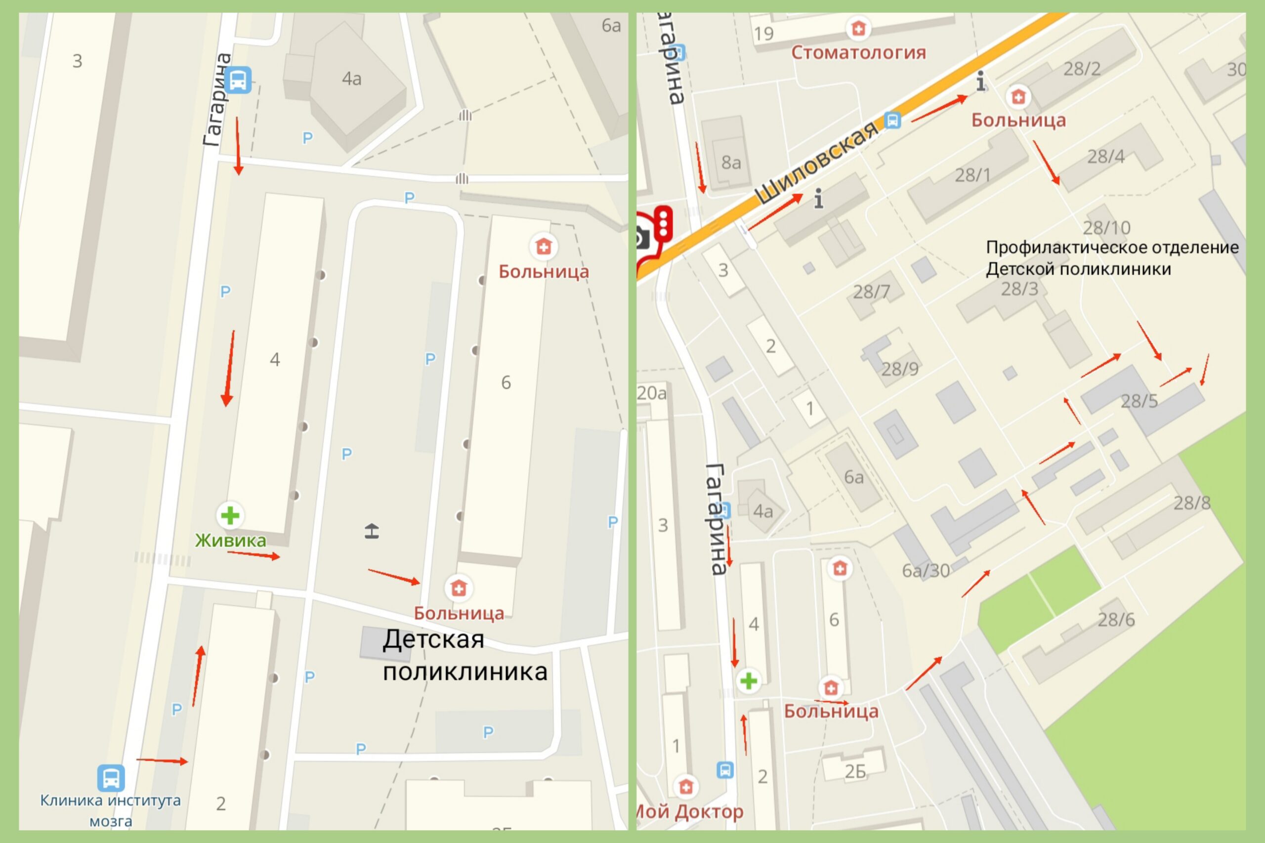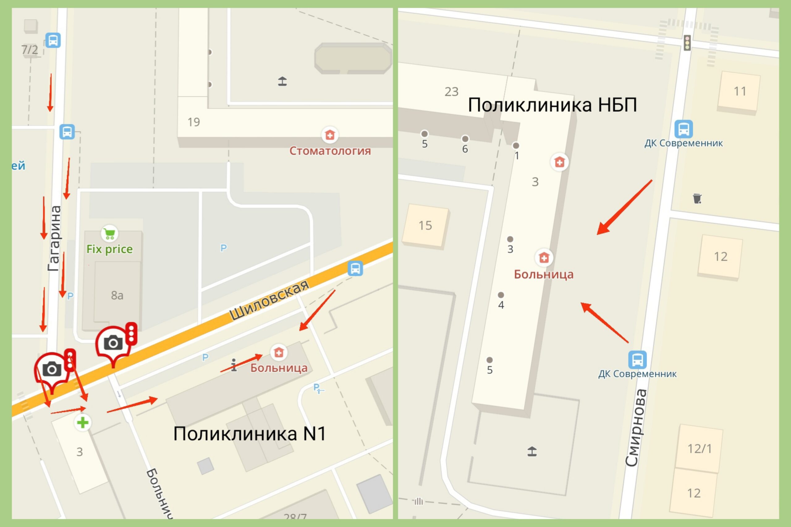 Схемы движения от ближайших остановок общественного транспорта до ближайшего входа в поликлинику
